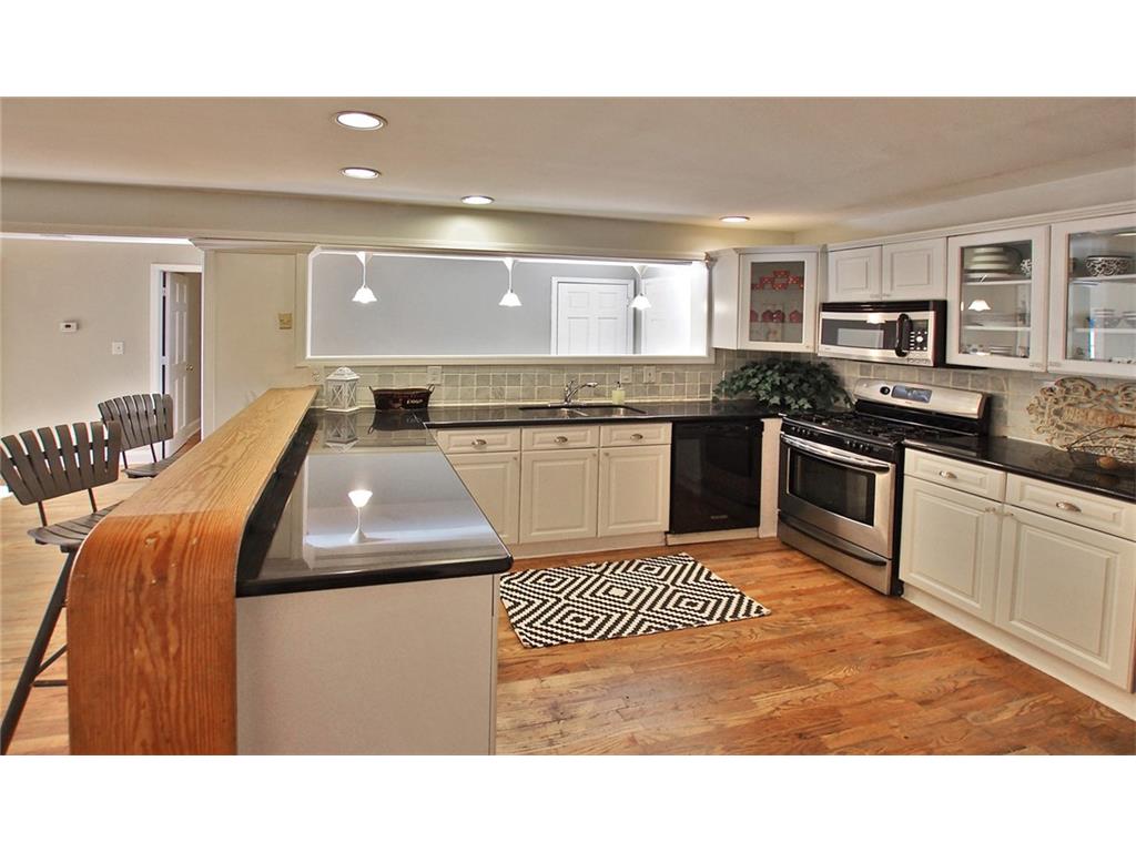 - Kitchen Breakfast Bar, Cabinets White, View To Fmly Rm, Counter Top - Stone