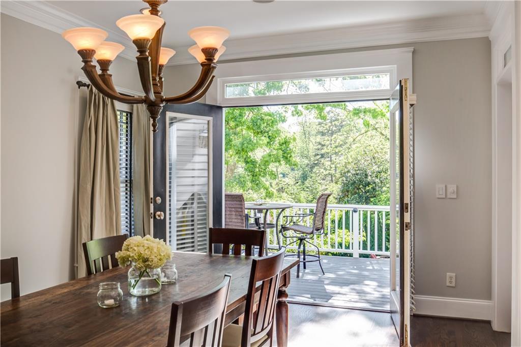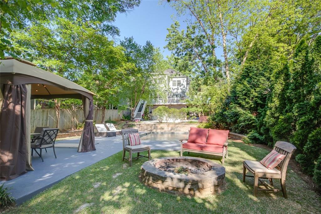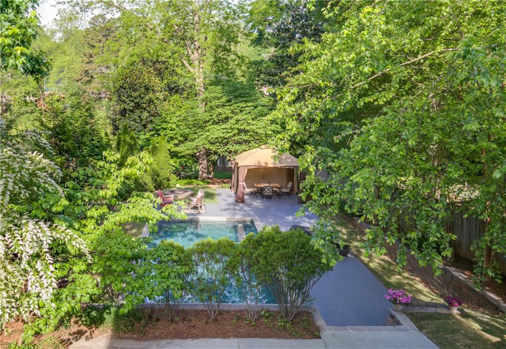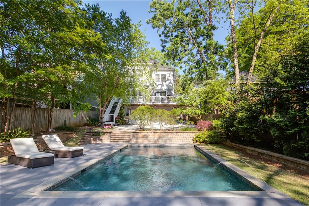 KIRKWOOD OASIS! Resort-like home on .4+ acres has a heated gunite pool w/ fountains, massage jets, gazebo, outdoor lights, expansive green space, 2 car garage, front/back decks for entertaining. Great location overlooking Coan Park, walk to Kirkwood Village, bike to the Beltline. Features include newly finished hardwood floors, natural gas fireplace, 6-burner gas stove, wired for sound throughout house including pool area. Large master suite has private covered porch for relaxing, 2 closets, and a bathroom w/ a steam and waterfall shower. Bonus space downstairs provides many options.