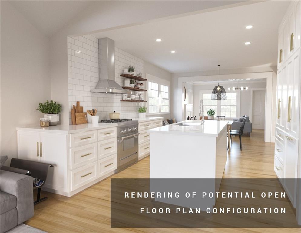 - Kitchen Cabinets White, Stone Counters, View to Family Room
